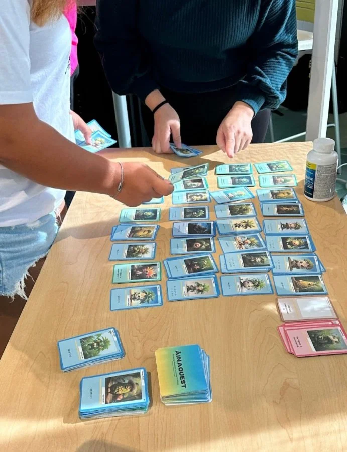 In December 2023, these two educators joined together with a diverse team of artists, technologists, and board game enthusiasts at the Build4Good AI Hackathon, hosted by Purple Mai‘a. There, out of our shared vision to deepen our pilina with native plants through interactive gameplay and cultural storytelling, ‘ĀinaQuest was born. In just 48 hours of collaboration, we designed, created, and printed our first deck of plant playing cards. The game was developed as an engaging way to learn about native plants and share stories of plants. We pictured educators using our game to nurture the next generation of locally grown Hawaiian botanists and ecologists and provide a pathway towards ʻāina-based stewardship.