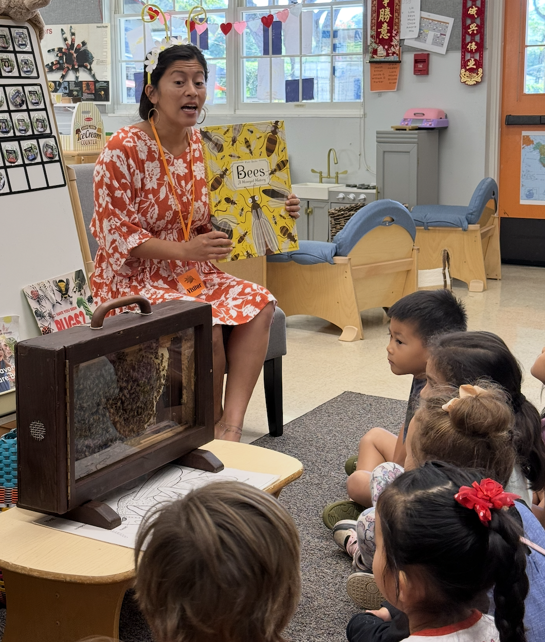 Once we knew what the basic characteristics of an insect are, we wanted to explore all the different types of insects. We jumped on a bus and went down to the University of Hawai‘i Insect Museum where we learned about classifications. Mr. Brad introduced us to the many different species they collect and study, and the children learned which insects are native, endemic, and endangered in Hawai‘i. The children were inspired by the museum and when we went back to school, we created a list of “Big Bug Words” to keep track of our vocabulary and hang in our classroom for children to add to. The children reflected on their learning by drawing the insects they observed, which inspired us to turn our dramatic play space into an entomologist lab. Children helped to sort and label pretend insects into trays, and put lab glasses on to study them. This space allowed children with different interests to try out new roles and explore their ideas. They built habitats with the tree blocks, learned how to operate a microscope, and so much more. All of this helped to build a strong conceptual foundation for further exploration in our unit – the students were ready for a deep dive into honey bees!