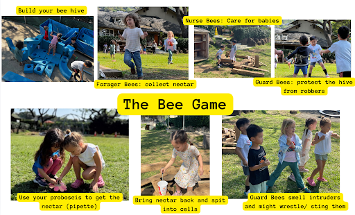 The biggest challenge and giggle-sparker was that once the game started, children learned they could communicate only through buzzes and gestures, just like bees. Thirty minutes of fun ensued, and we noticed a lot of excited and dedicated bees collecting nectar and committing to their roles and jobs. It was chaotic, but so is a beehive! The children worked really hard and were hot and sweaty and exhausted by the end, but they had fun and felt accomplished. Once we were back inside, we reflected on The Bee Game experience, with the children noticing that it was hard work. We also reflected on our strategies, saying it was much easier to collect nectar from the closest flowers than it was to invade the other hive, and that led to one team having more success. After reflecting, we poured each team’s collected nectar into a cup, put the cups next to each and observed the volume, and it was astonishing to see how little nectar was actually collected! After all that hard work, we collected just a few ounces! We certainly have a new appreciation for bees, and we won’t take honey for granted anymore! The students shared: