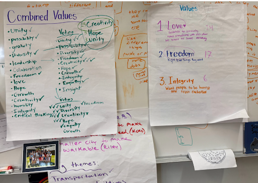 Then, the discussion on values happened. It lasted for three class periods, much longer than we had expected. Students went back and forth: What is important to us? What will be important when guiding our choices for a city that doesn’t even exist yet?