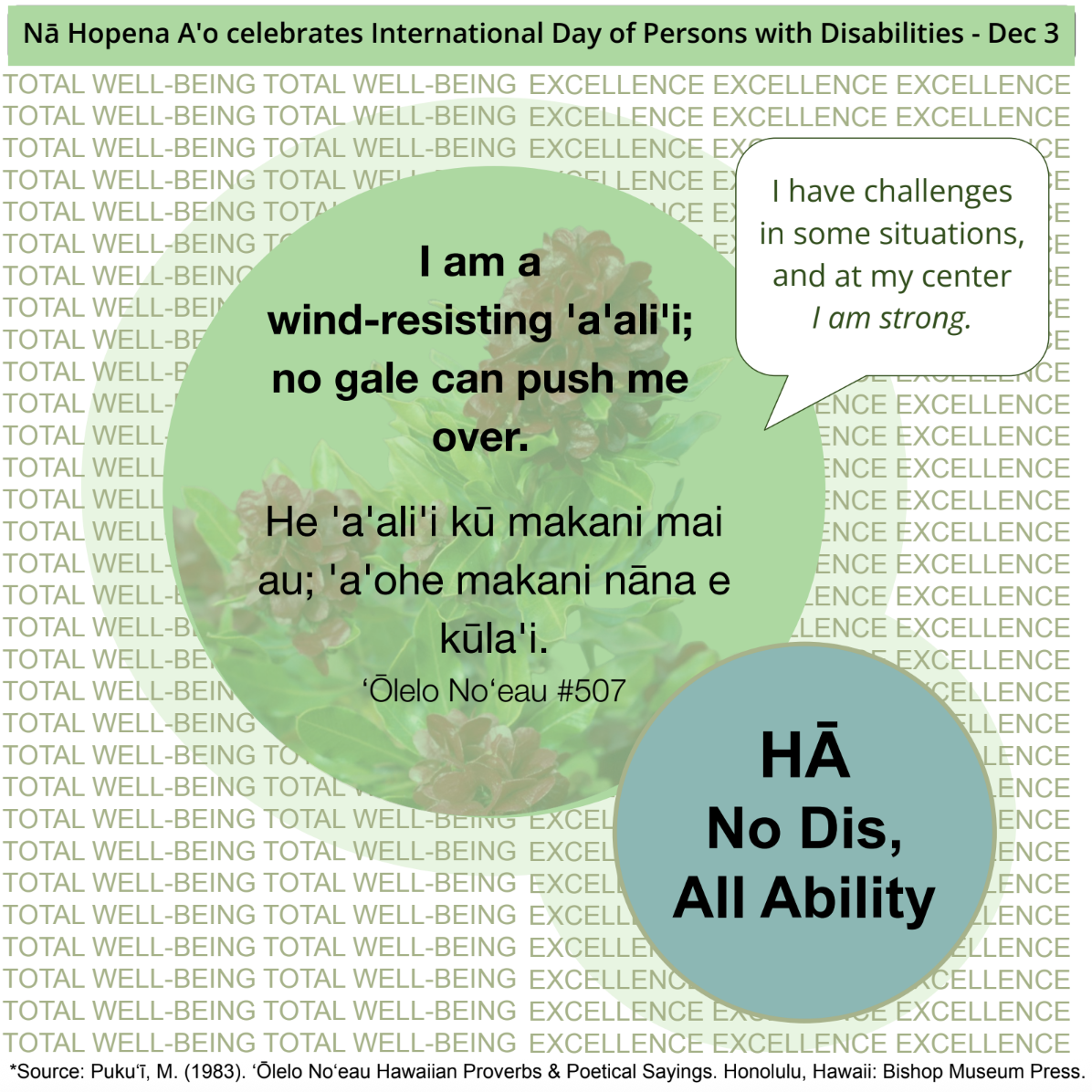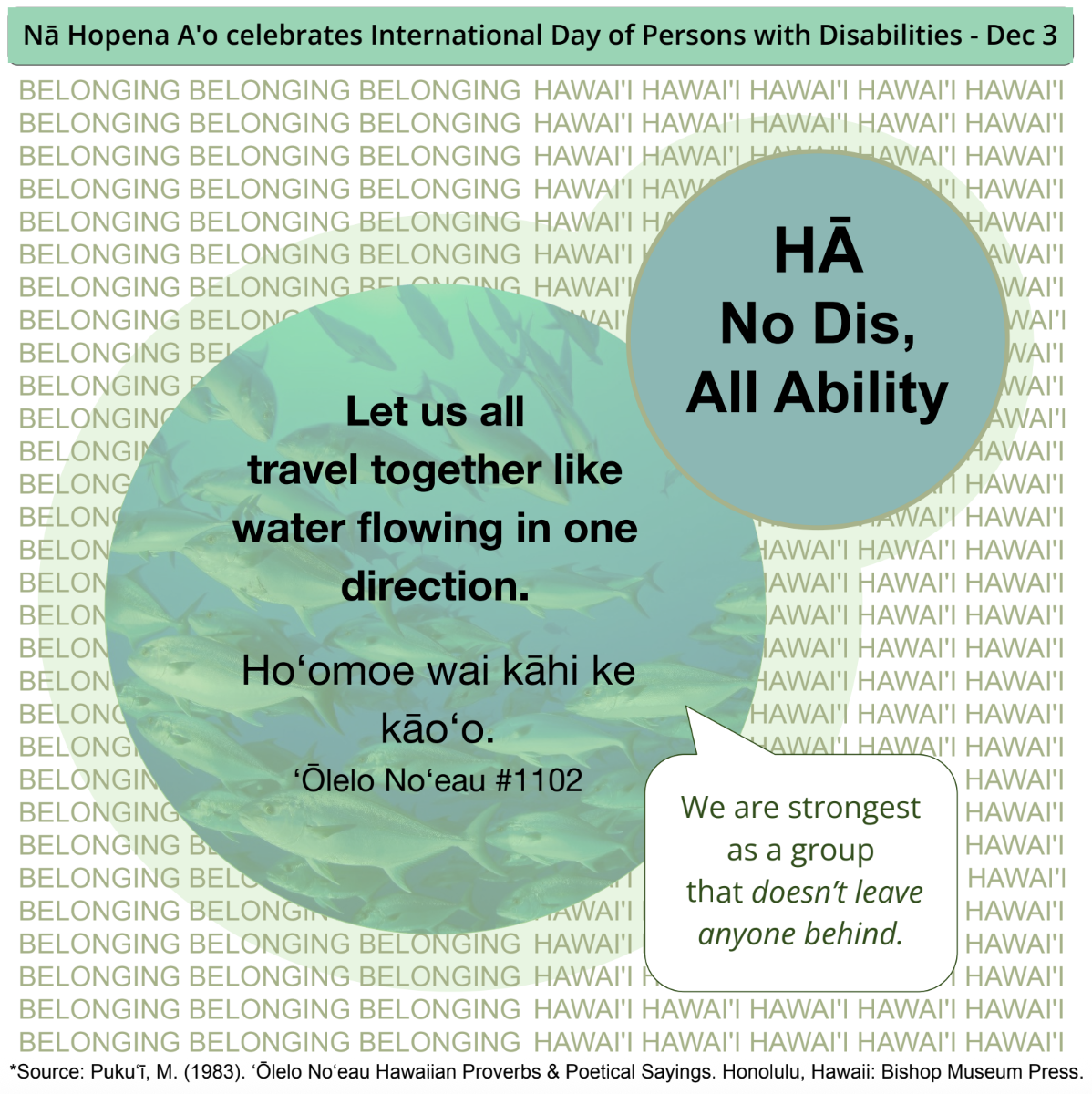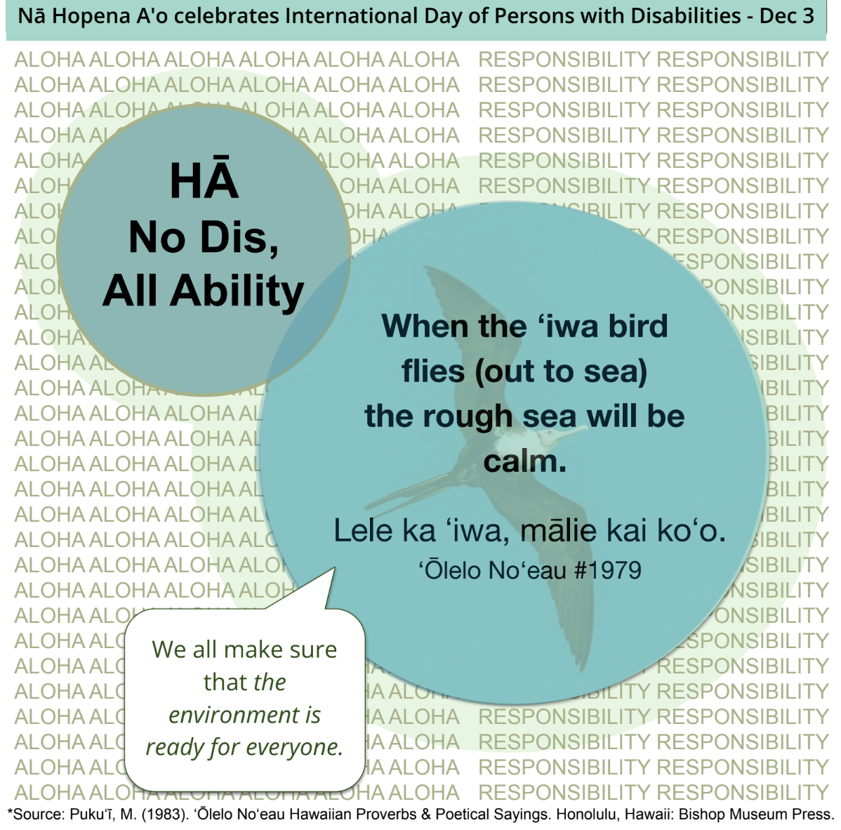 As a graduate student pursuing a certificate in Disability and Diversity Studies at the University of Hawaiʻi (UH), my project started as a campaign (No Dis, All Ability) to get rid of outdated institutional thinking about disability. I started with graphics that I turned into stickers that utilized ‘Ōlelo No‘eau to spread a more humane and modern way of talking about disability, according to what I was learning at UH. To sum it up very basically, the old model assumes disability: