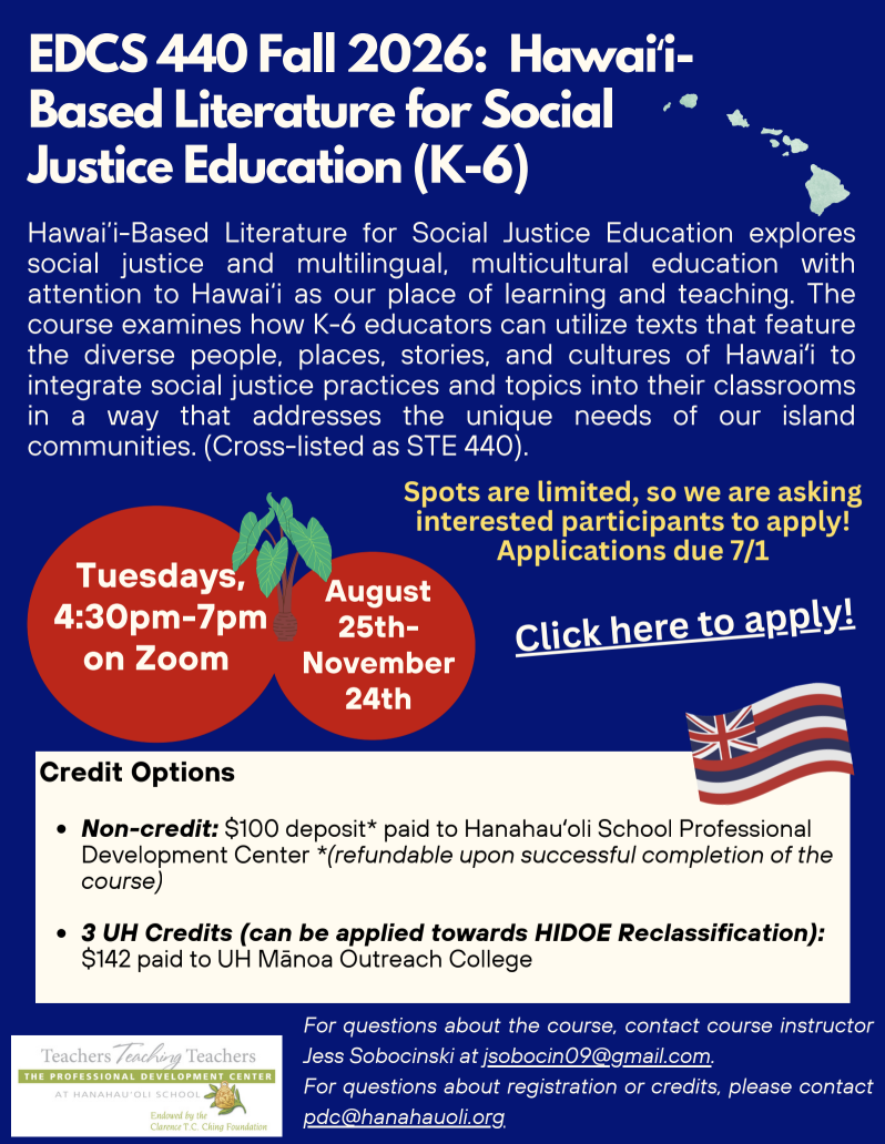 Participants can expect to engage in robust discussions about the landscape of social justice education in Hawai’i; learn research-based teaching practices and how those practices intersect with Hawaiian-focused education and ʻāina-based learning; and investigate strategies for incorporating age-appropriate texts to support social justice education across multiple subject areas. The instructor will share examples of how they have applied Hawai’i-based texts in their own classrooms, in alignment with their grade-level content standards and curriculum. The course will culminate in a project in which participants will create a lesson, text, or other project that applies literature as a tool to teach about social justice in a Hawaiʻi context.